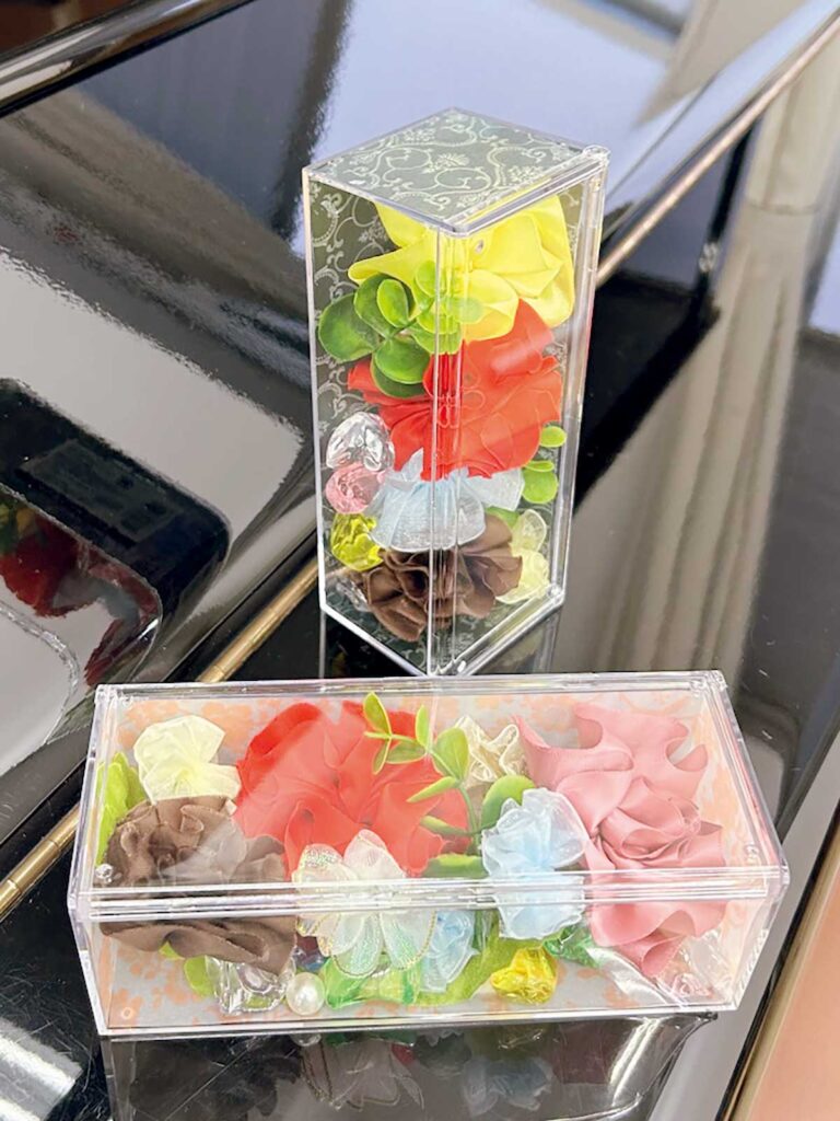 基本の簡単ソーイング!リボンでかわいいお花を作り、ボックスにつめ込みます。色とりどりのお花でお部屋も気分を明るく!