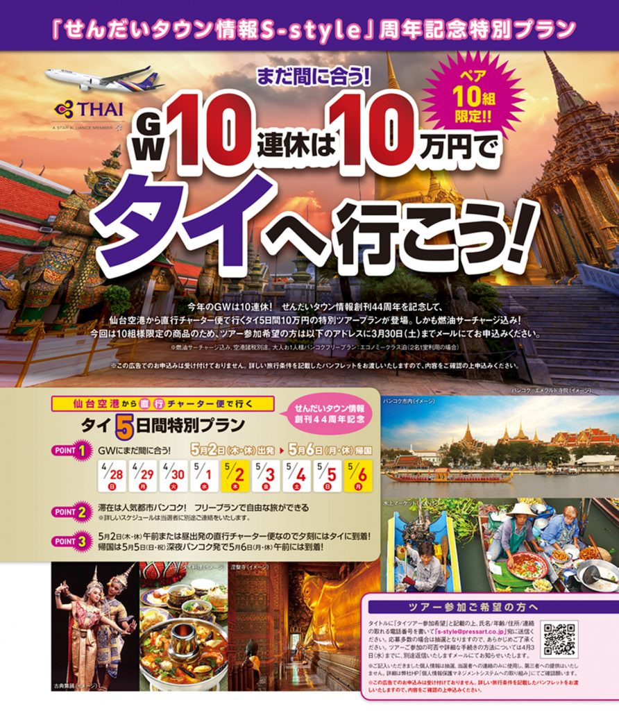 せんだいタウン情報創刊44周年を記念して、仙台空港から直行チャーター便で行くタイ5日間10万円の特別ツアープランが登場。しかも燃油サーチャージ込み! 今回は10組様限定の商品のため、ツアー参加希望の方は3月30日(土)までメールにてお申込みください。