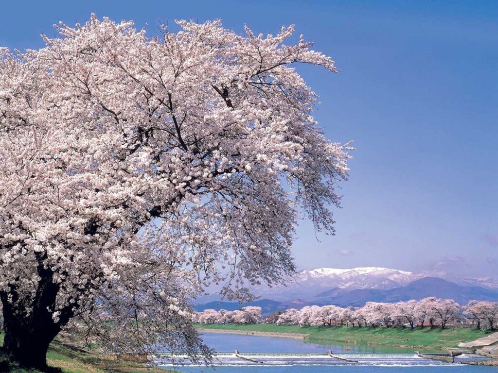 白石川の澄んだ青、桜のやわらかな淡紅、そして蔵王連峰に残る雪の白。