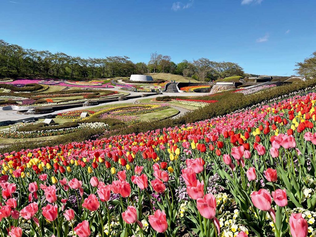 約1,400本の桜や、56品種約85,000本のチューリップなど、春の花々が園内を彩ります