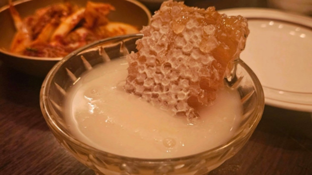カットされたはちみつのブロックが入ったマッコリは見た目もインスタ映え確定。