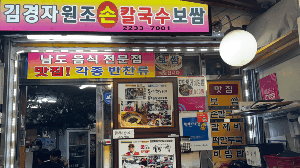 狎鴎亭からすぐ、金湖洞(クムホドン)にある歴史の長い市場、金南市場(クンナムシジャン)の中にあるポッサムとカルグクスが人気のお店。