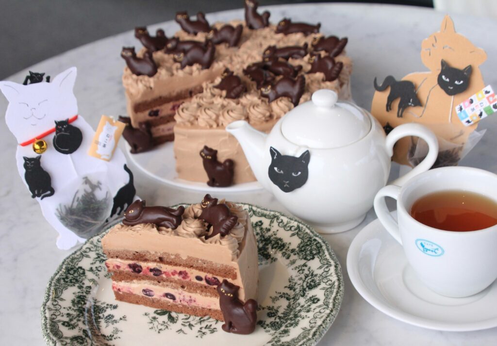 猫型チョコを添えたケーキと猫のタグがついた「ね紅茶」のセットは、博物館2階の「カフェモ一ツァルトテオ」との限定コラボメニュー。
