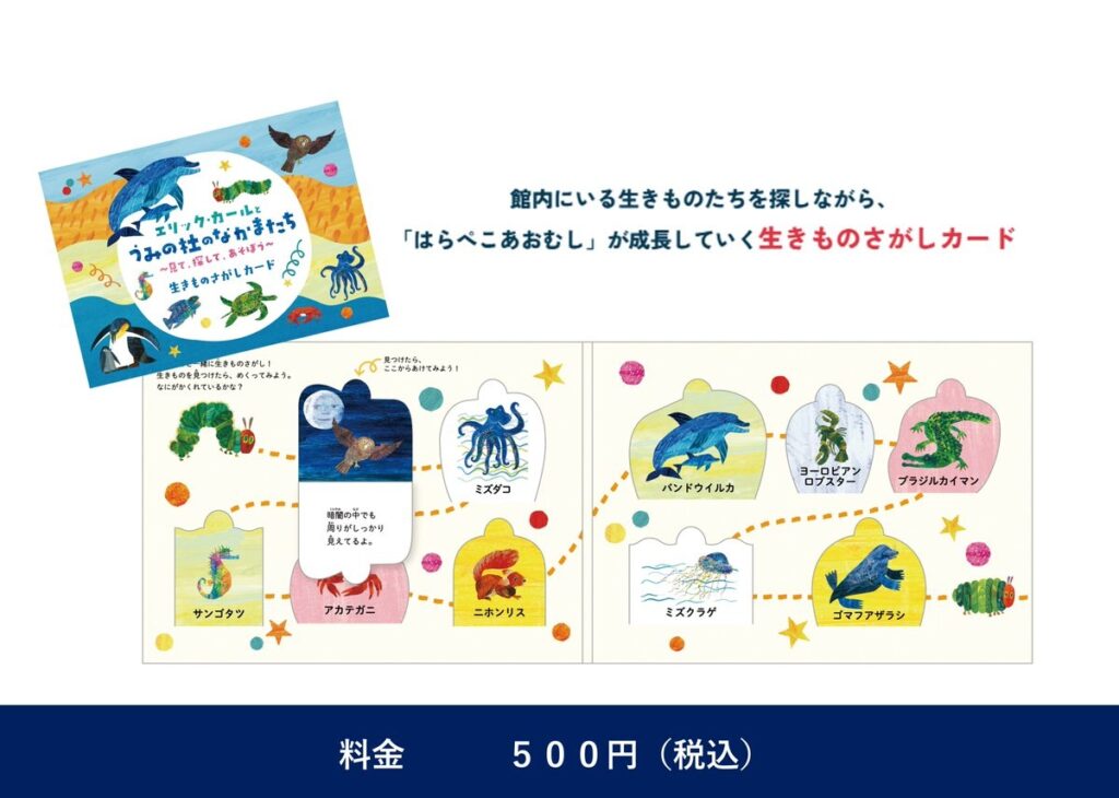 「生きものさがしカード」では絵本のようなカードを手に、館内で生きものを見つけていく(参加費500円)