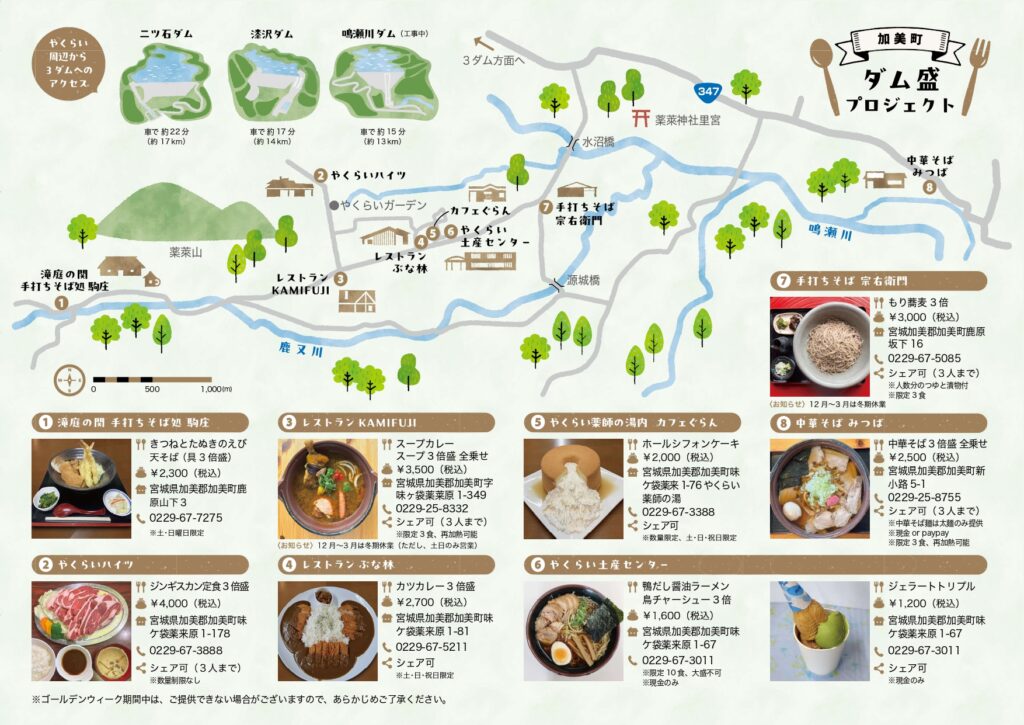 『二ツ石』『漆沢』『鳴瀬川』という「3つのダム」にちなんで、通常メニューの「3倍盛り」が薬莱地区の8つの参加店で楽しめる企画です。