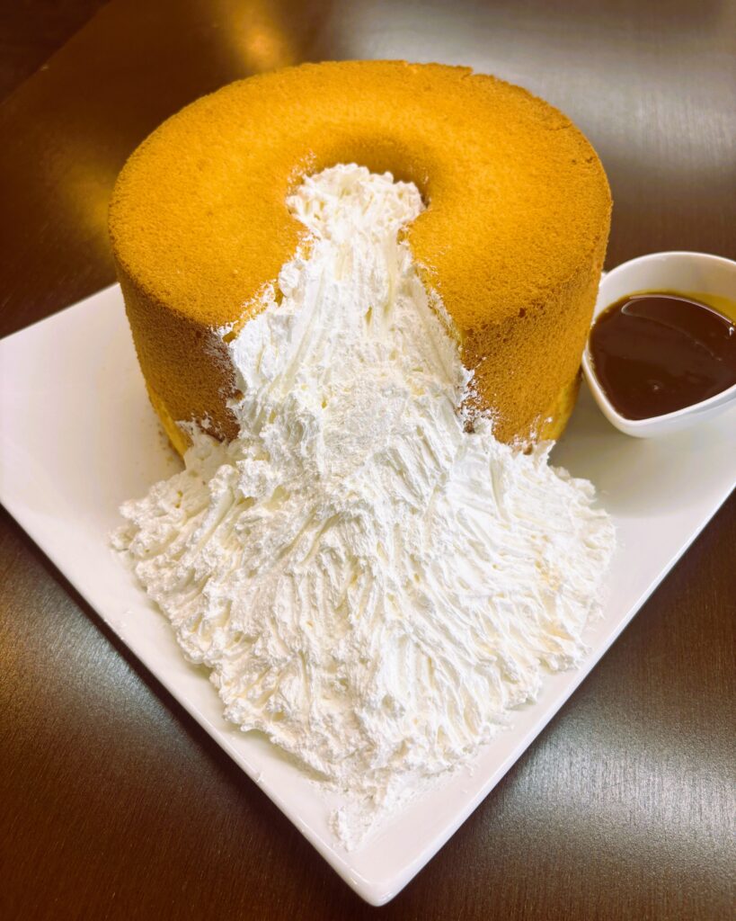 『カフェgland(ぐらん)』の「ホールシフォンケーキ」(2,000円)。クリームはダムの放流をイメージ