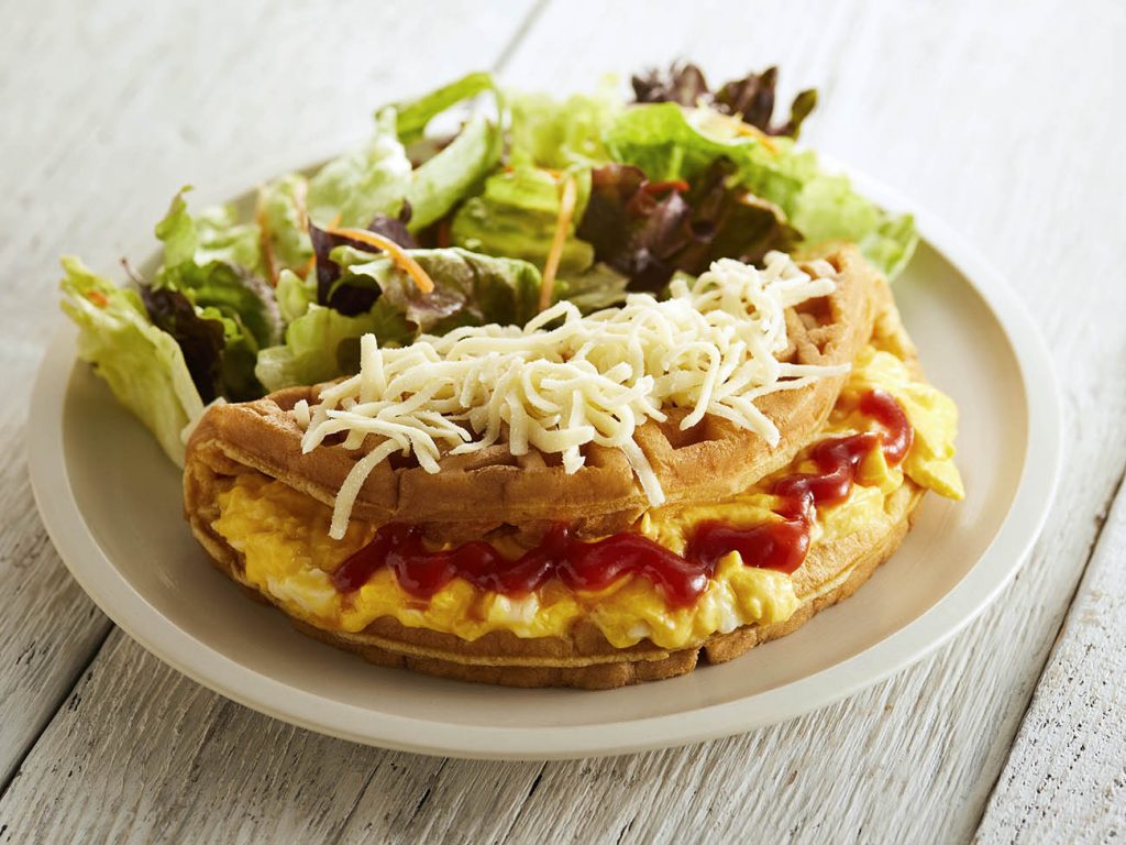 ふんわりとしたワッフルにスクランブルエッグをサンド。さらに、コクのあるシュレッドチーズをトッピングした、お食事系ワッフルです。サラダがそえられた、満足度の高い一皿です。