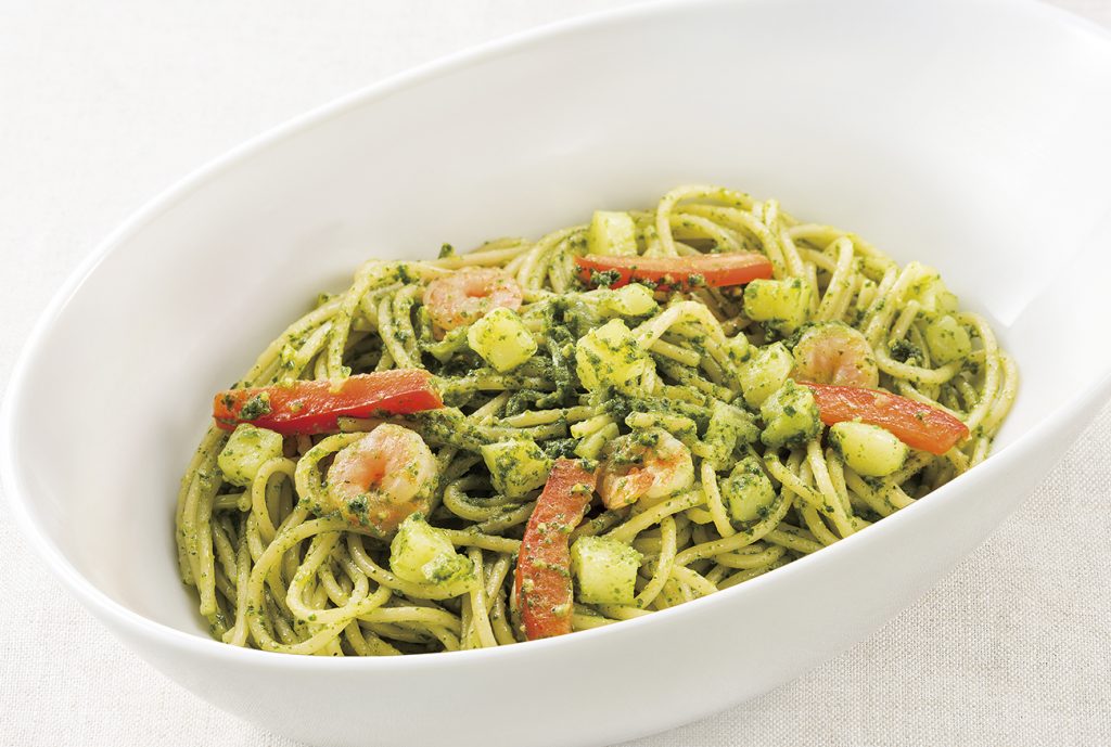 彩り鮮やかなグリーンカラーとバジルの豊かな風味が特徴のジェノベーゼのパスタに、小エビとジャガイモをイン! コクがありながらもさっぱりと味わいが特長です。