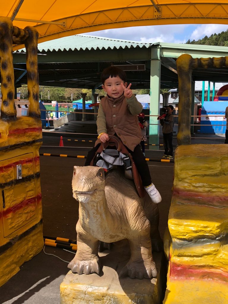 息子が興味深々だった恐竜の乗り物。憧れのティラノサウルスはあいにく4歳以上だったので乗れず…でしたが、ちびっ子向けのミニ恐竜にまたがってにんまり。