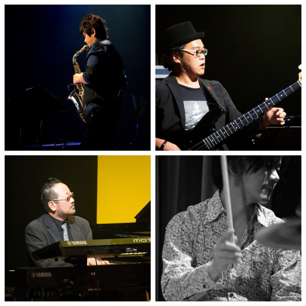 藤村竜也(Bass・右上)、祖田 修(piano・keyboard・左下)、渕 雅隆(Drums・右下)