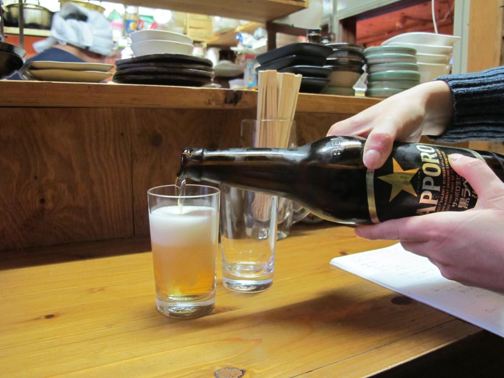 ビールを注いで、おっとっと。局長とふたりで乾杯!