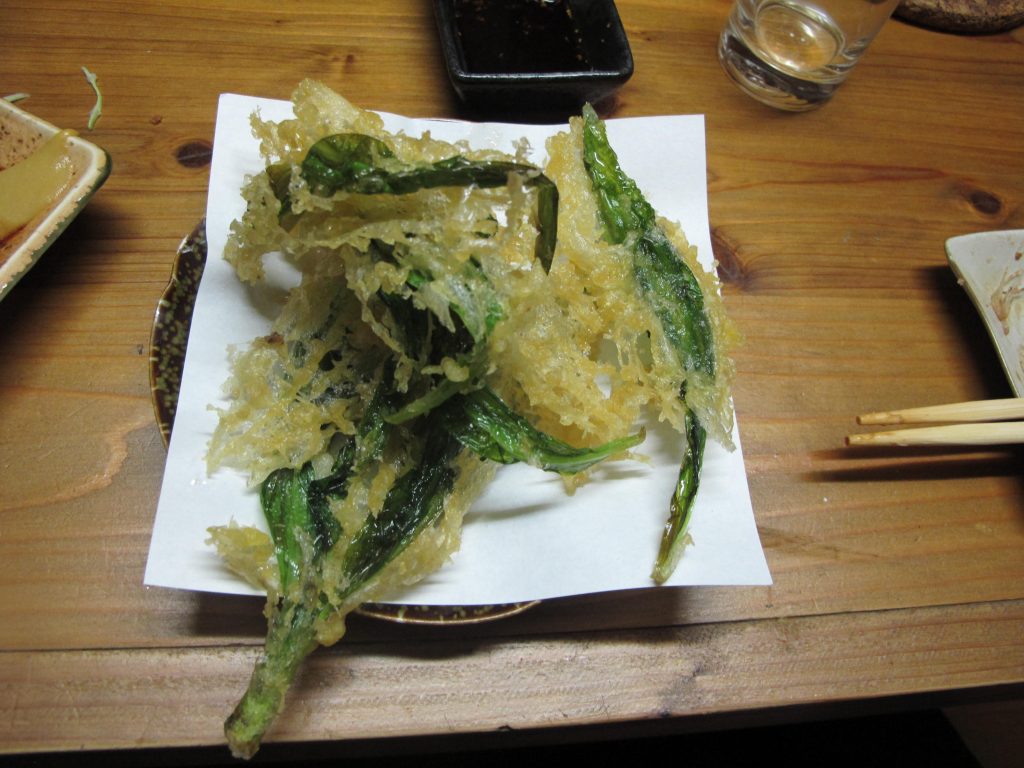 これはニンニクの芽の天ぷら。カラッと揚がっていて軽い食感です