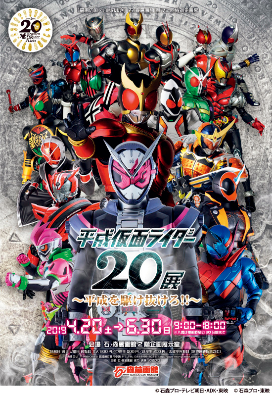 「仮面ライダークウガ」から始まり、これまでに多くのライダーが誕生してきた“平成仮面ライダーシリーズ”。現在、放送されている20作目の記念作「仮面ライダージオウ」までの全20作品分の変身シーンや名場面をパネルなどで紹介。過去に販売された変身ベルトや玩具の展示もお見逃しなく!
