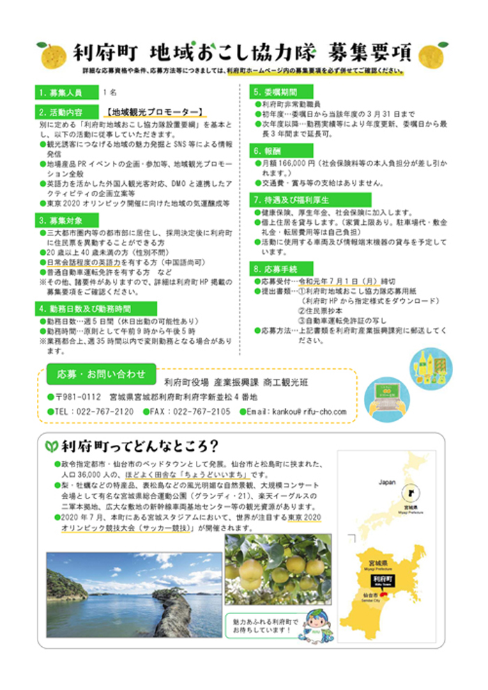 新たな視点や発想力により利府町の潜在能力を引き出し、観光誘客につなげる地域の魅力発掘と情報発信、地場産品のPRイベントの企画・参加など、地域住民と一緒になり、地域の将来を担っていく意欲ある方を大募集。興味のある人は一度問い合わせてみてくださいね。