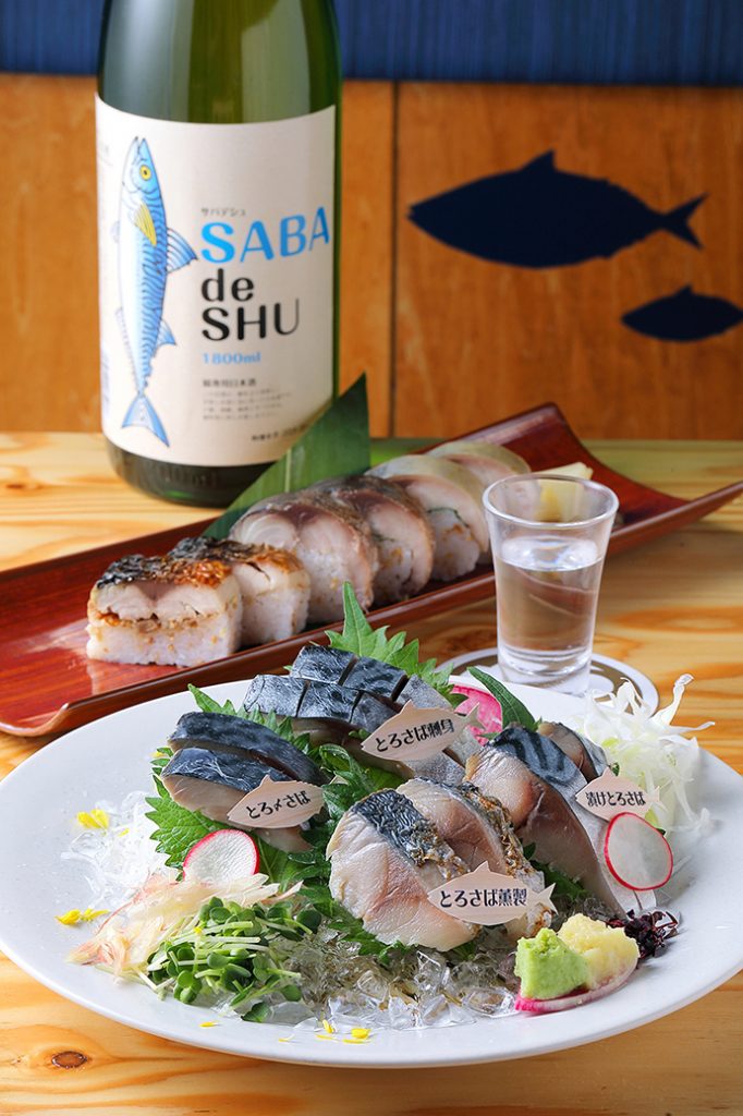 刺身、〆さば、漬け、燻製が一度に楽しめる「SABAカルテット盛合せ」(1,280円)には「サバde酒」(1合700円)がおすすめ