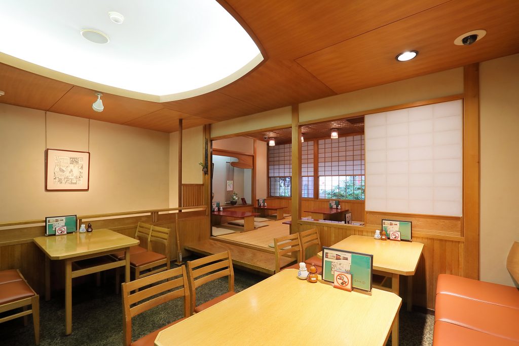 小上がりも備えた2階席。1階はテーブル席で、3階には製麺室を備えている