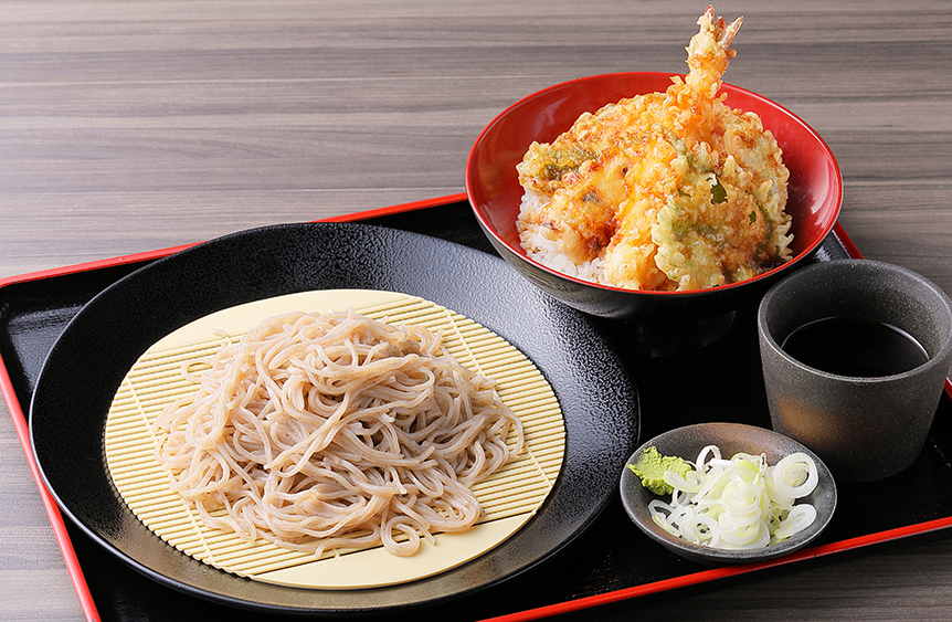 「天丼セット」(600円※ミニ丼530円)。のど越しの良いざるそばに、カラリと揚げたエビやカボチャの天丼が付くボリューム満点の人気メニュー