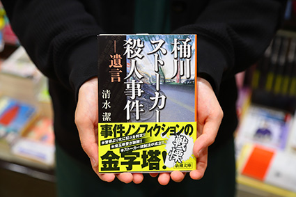 「こちらは実際に起こった『桶川ストーカー殺人事件』について書かれた、ノンフィクション作品です。被害者は21歳の女子大生。殺害についての真相が分からないまま、迷宮入りするかと思われていたこの事件。あるひとりの新聞記者の執念の取材によって、真犯人とと警察の闇が暴かれるのです。❝記者の教科書❞とも評されたこちらの一冊。ルポルタージュが好きな方はぜひ読んでみてくださいね」。