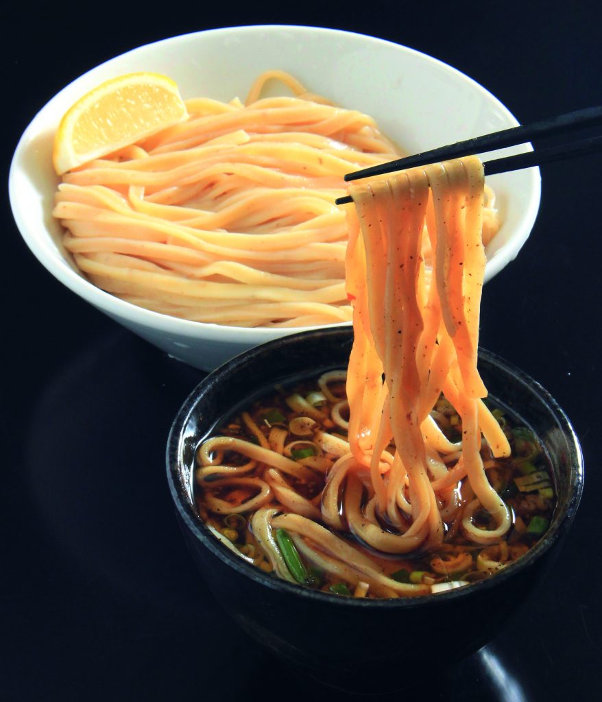 まずはひと口つけ汁をすすれば、ガツンとしたブラックペッパーのインパクトと共にニンニクの風味がジワリ。スープが喉を過ぎる頃には、鶏ガラと豚骨ダシの旨み、醤油やみりんをはじめとする20種以上の調味料が織りなす複雑な甘み・辛み・酸味が渾然一体となり、そのおいしさが幾重にも膨らんでいく。平打ちのパスタを連想させるような、全粒粉入りの自家製極太麺は、つるつるとしたのど越しとモチモチの歯ごたえ、そして小麦の香りが抜群。口いっぱいに頬張って豪快にいただけば、そのおいしさのトリコになること間違いなし!