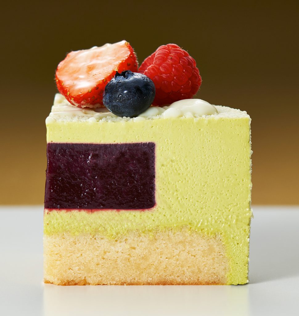 ピスタチオの“緑”に、ミックスベリーの“真紅”がクリスマスらしい華やかな一品。ピスタチオムースの中には、アーモンド風味のフィナンシェ生地と甘酸っぱいジュレが隠れている。