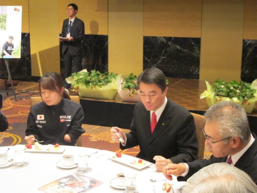 村井嘉浩宮城県知事、仙台市で活動するバドミントンの亀山 楓選手もにこにこベリーを堪能! この日の村井県知事はにこにこベリーに合わせて赤いネクタイをチョイスしたとか!
