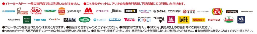 アリオ仙台泉 専門店街で使える2,500円分のチケット(500円券×5枚)が2,000円で販売される、とってもお得なイベントです。