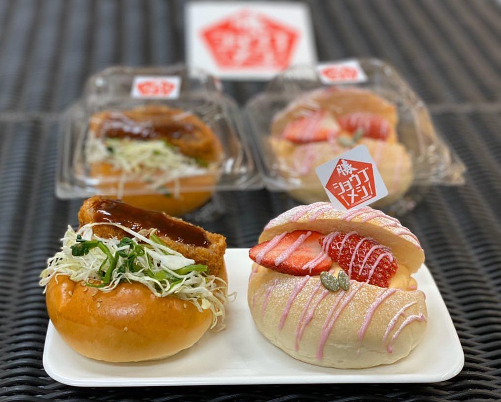 『えとふぇ』(太白区泉崎)の「競り勝つバーガー」(左・290円)と「 いちご(一発合格)のえとふぇ~ニコニコベリー使用~」(右・220円)※どちらも税抜き価格