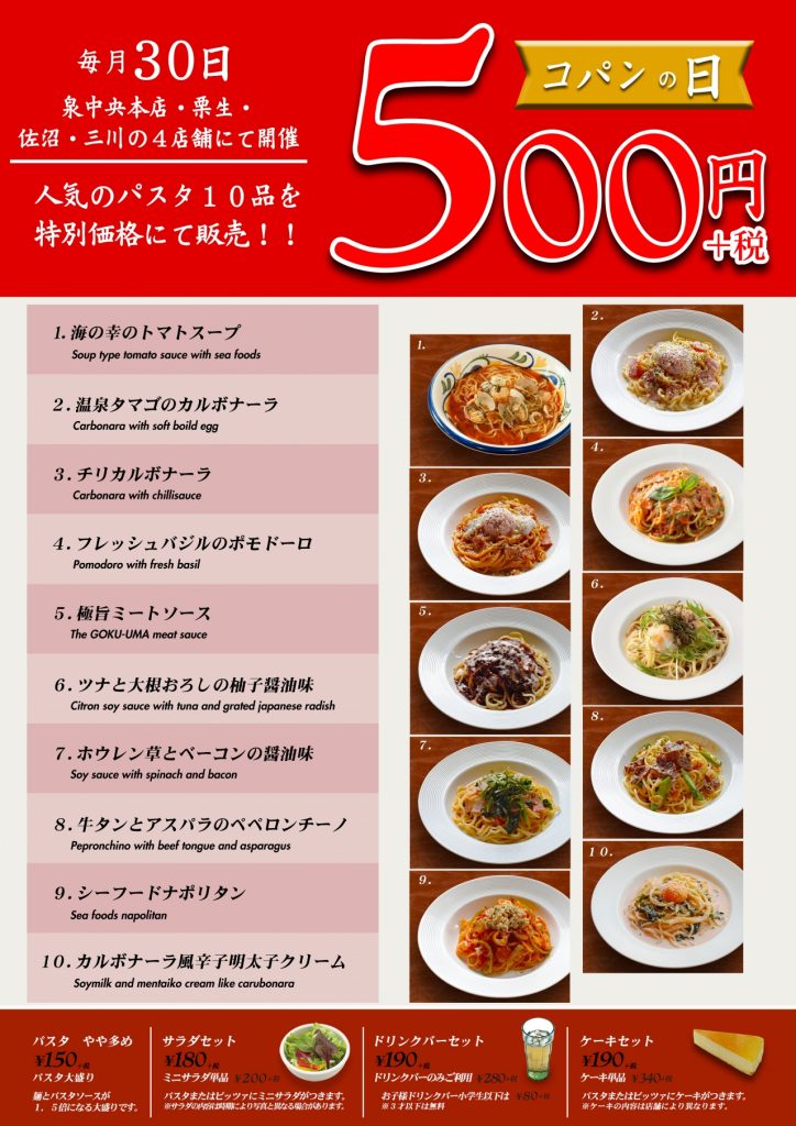 こだわりの生麺パスタを提供する生パスタ専門店『コパン』。毎月30日を「コパンの日」として、寒い日にほっと温まる「海の幸のトマトスープ」や、仙台らしい「牛タンとアスパラのペペロンチーノ」、GOちゃんイチオシの「ツナと大根おろしの柚子醤油味」などなどの10品が特別価格550円で食べられます。