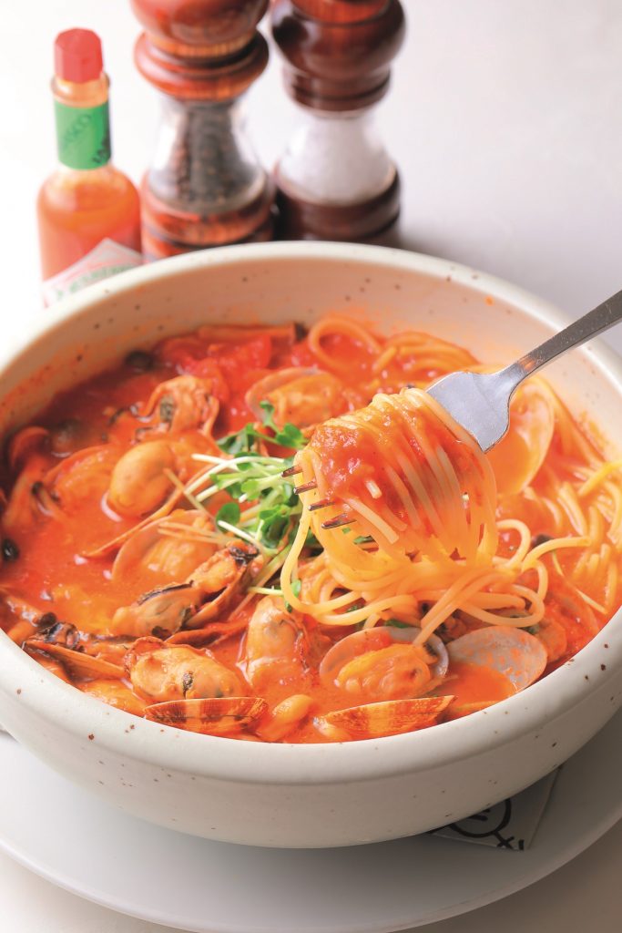 二軒目は、200種類ものメニューを誇るスパゲティ専門店『平井スパゲティ』。寒い日にぜひとも食べたいのが、200℃のオーブンで表面を焼き上げ、調理したフライパンのまま提供される「焼きトマトクリームソース」です。自家製クリームソースと、本場イタリアでシェアNo.1を誇るバリラ社製パスタを使った逸品!とろりと溶ける香ばしいチーズをたっぷり絡めて召し上がれ!