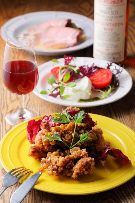 ディナーメニューの「マチルダの唐揚げ」(660円)、「フルーツトマトのカプレーゼ」(880円)、「自家製豚肩ロースハム」(660円)」