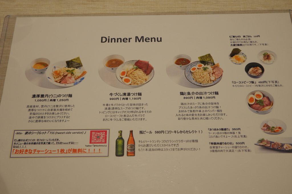 夜のメニューがこちら。濃厚ウニつけ麺はまるでパスタみたいでおいしそう…!