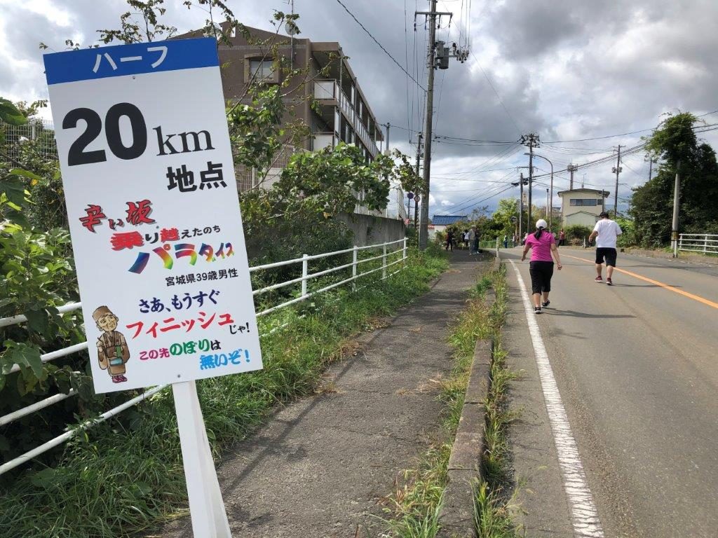 見てください! なんと20km地点の看板を撮影できている…! ということは、そうです。なんと編集部はまじ&GOちゃん、周囲の予想を裏切り15kmの関門を突破。ゴールに向けて走り続けておりました! 「松島ハーフマラソン大会」名物の川柳看板が、「さあ、もうすぐフィニッシュじゃ!」と後押ししてくれています。さて、気になる結果は…。