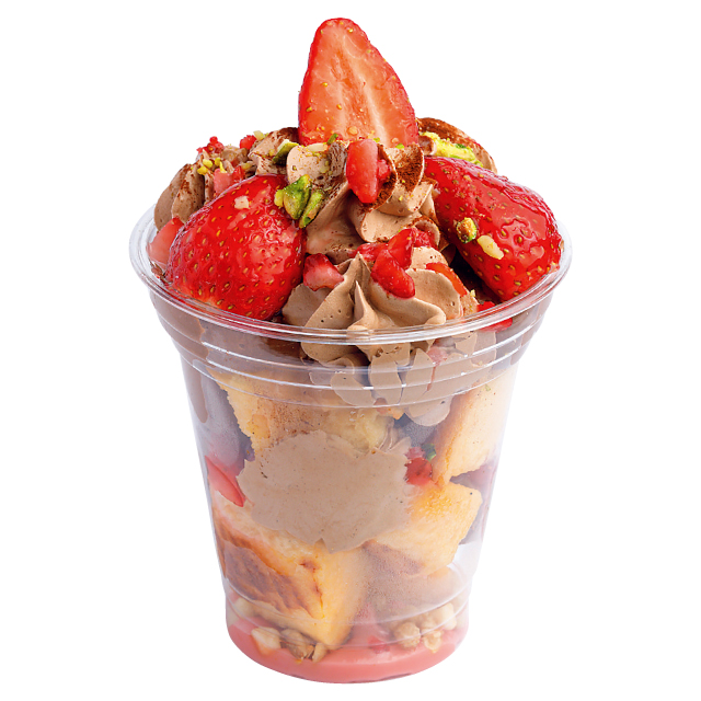 米粉を使ったふわふわフレンチトーストや濃厚なベルギーチョコレートのムース・ホイップクリームなどをバランスよくカップにイン! にこにこベリーの甘酸っぱさが良いアクセントに。