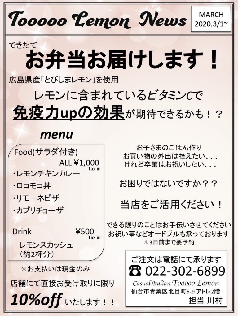 S-style本誌でもご紹介したことがある、仙台市青葉区北目町にあるレモン専門イタリアン『Tooooo Lemon(トゥーレモン)』から耳寄りな情報が届きました!
