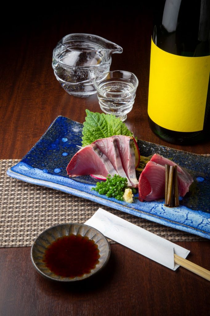名物はカツオの刺身。たっぷり脂ののった腹側は銀皮造りで芽ネギと生姜醤油で。ややさっぱりとした背側は、ニンニクの芽のたまり漬で。土鍋で炊いためしに、ヅケにしたカツオをのせて熱いダシをかけて食べる「カツオ茶漬け」も人気の一品です。