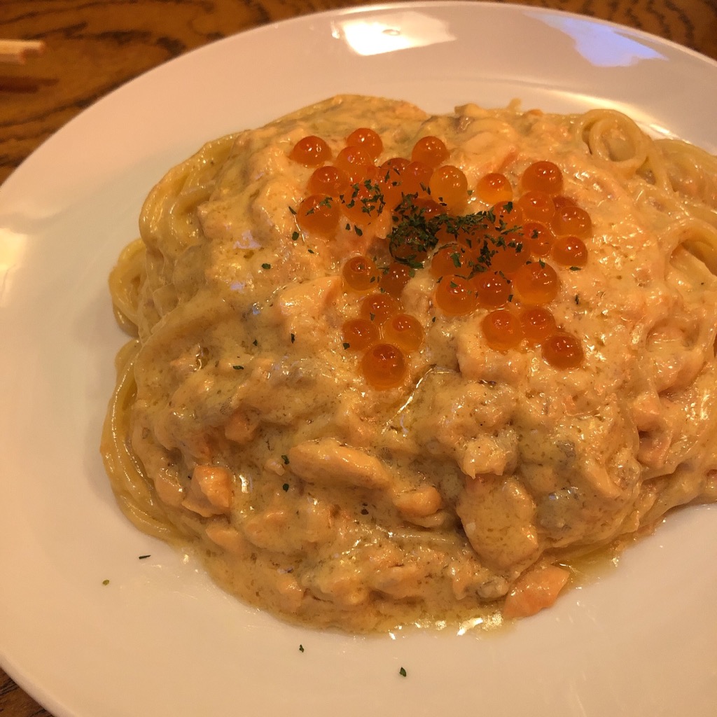「鮭ボナーラ」。こってりしたソースに銀王の旨みが相まって、お酒が進む味です。そしてネーミングが良い