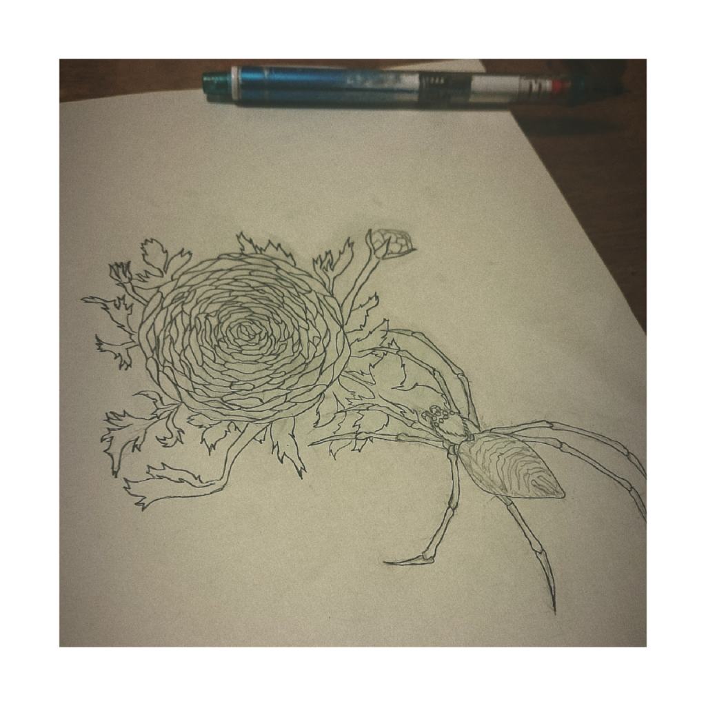 「”タトゥー”っぽいイラスト…なので、風景画や人物絵というよりは、なにかアイテムを描くことが多いですね。花びらを一枚ずつ丁寧に描くとか細かい作業が大好きで、気づいたら1時間とかずーっともくもくと取り組んでいます(笑)」