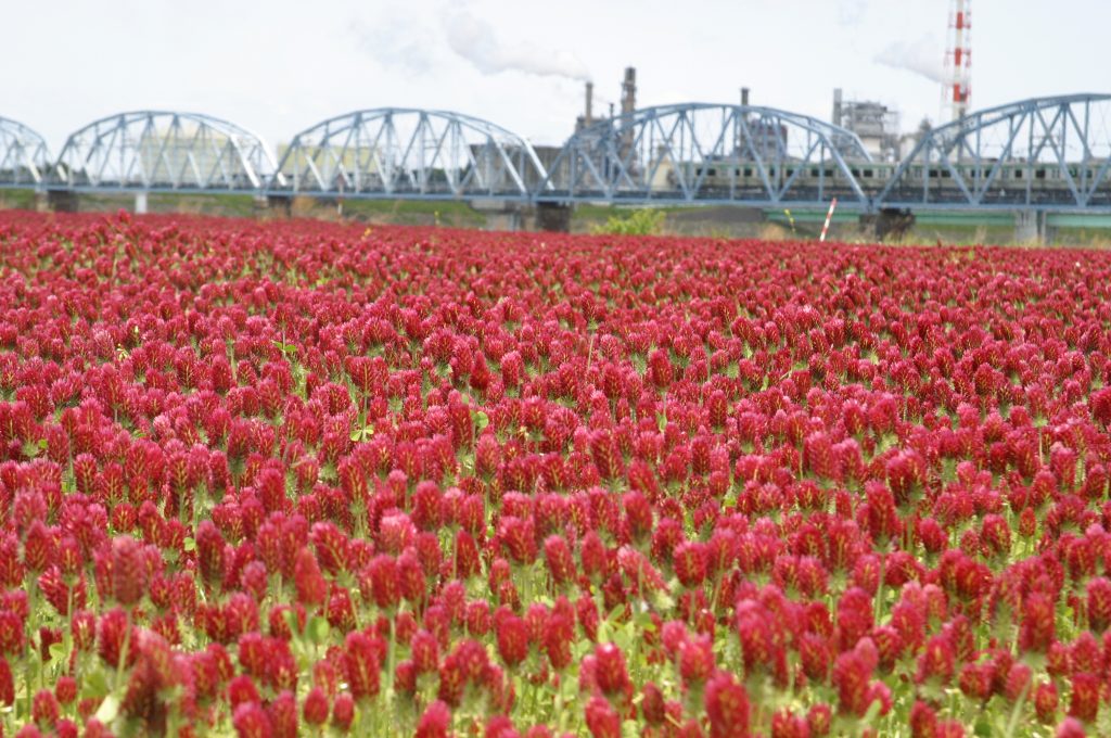 阿武隈川の河川敷に地元住民が大切に育てている花畑。“ストロベリーキャンドル”とも呼ばれるクリムゾンクローバーの穂状の赤い花が咲き誇ります。電車の車窓から見える赤一色の景色は一見の価値あり! また、夏にはひまわり畑に様変わりし、季節ごとに素敵な景色を見せてくれます。