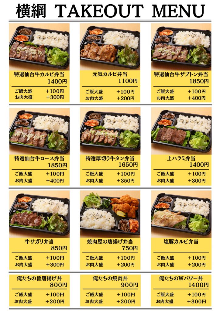 そんな『俺たちの焼肉屋 横綱』では、A5仙台牛の弁当各種など、焼肉専門店だからこそのテイクアウトメニューが目白押し! 丼ものや、牛タン弁当などボリューム満点なメニューもあるので、自宅や職場で焼き肉弁当を楽しんでみましょう。