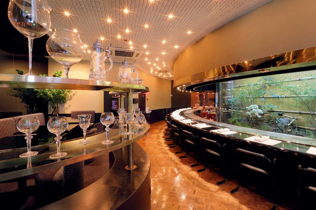 目の前に広がる日本庭園を見ながらの食事が楽しめるカンター席は18席。ゆったり座れる仕様