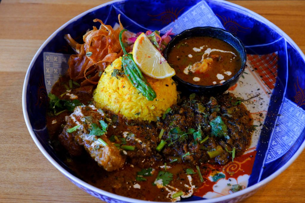 また、西インドの酸っぱいカレー「ポークヴィンダルー」やエビの歯触りが楽しい「海老のスープカレー」もそれぞれ、仲原さんが腕によりをかけたひと品です。クミンや八角、クローブなどのスパイスをベースに、なんとキーマに至っては8種類のホールスパイスと10種類ものパウダースパイスを使っているんだそう!小麦粉や水を使わずに作るスパイスカレーは、なんと言ってもその香りが魅力。スパイスの組み合わせや塩の使い方、火加減や順番などで「キリッとした香り高いスパイス感」を引き出すのがポイントとのこと。付け合わせの揚げサツマイモや紫キャベツのアチャール(漬物)も彩りや食感、味の変化を与えてくれるこだわりの名脇役です。